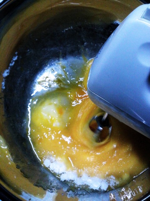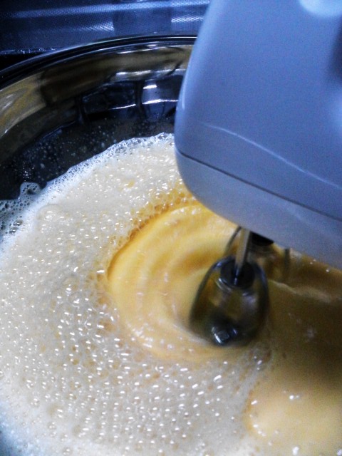 約45℃で湯煎しながら、ハンドミキサー
